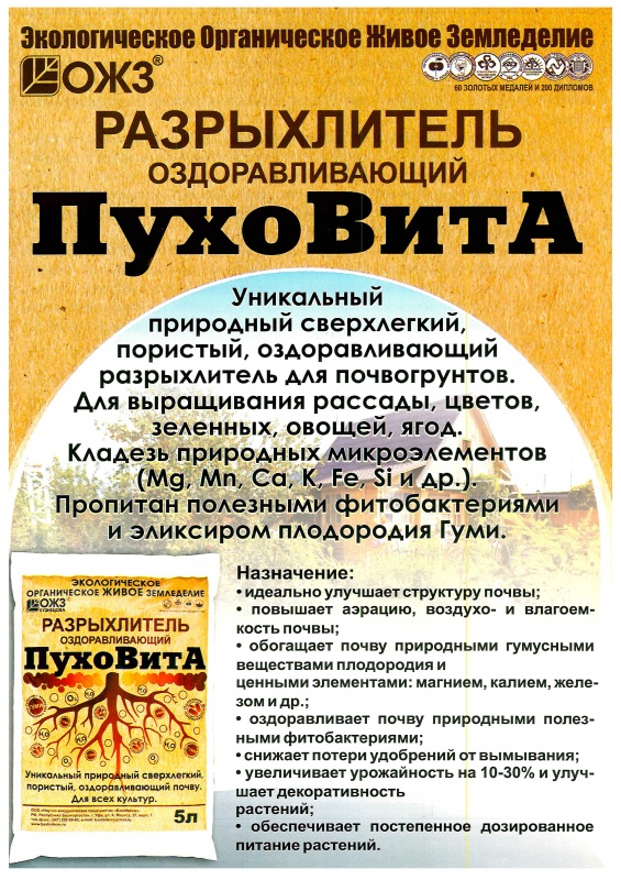 РАЗРЫХЛИТЕЛЬ оздоравливающий ПухоВита 5 л -это Уникальный природный сверхлегкий, пористый, оздоравливающий разрыхлитель для почвогрунтов. Для выращивания рассады, цветов, зелени, овощей,ягод - для всех культур.
