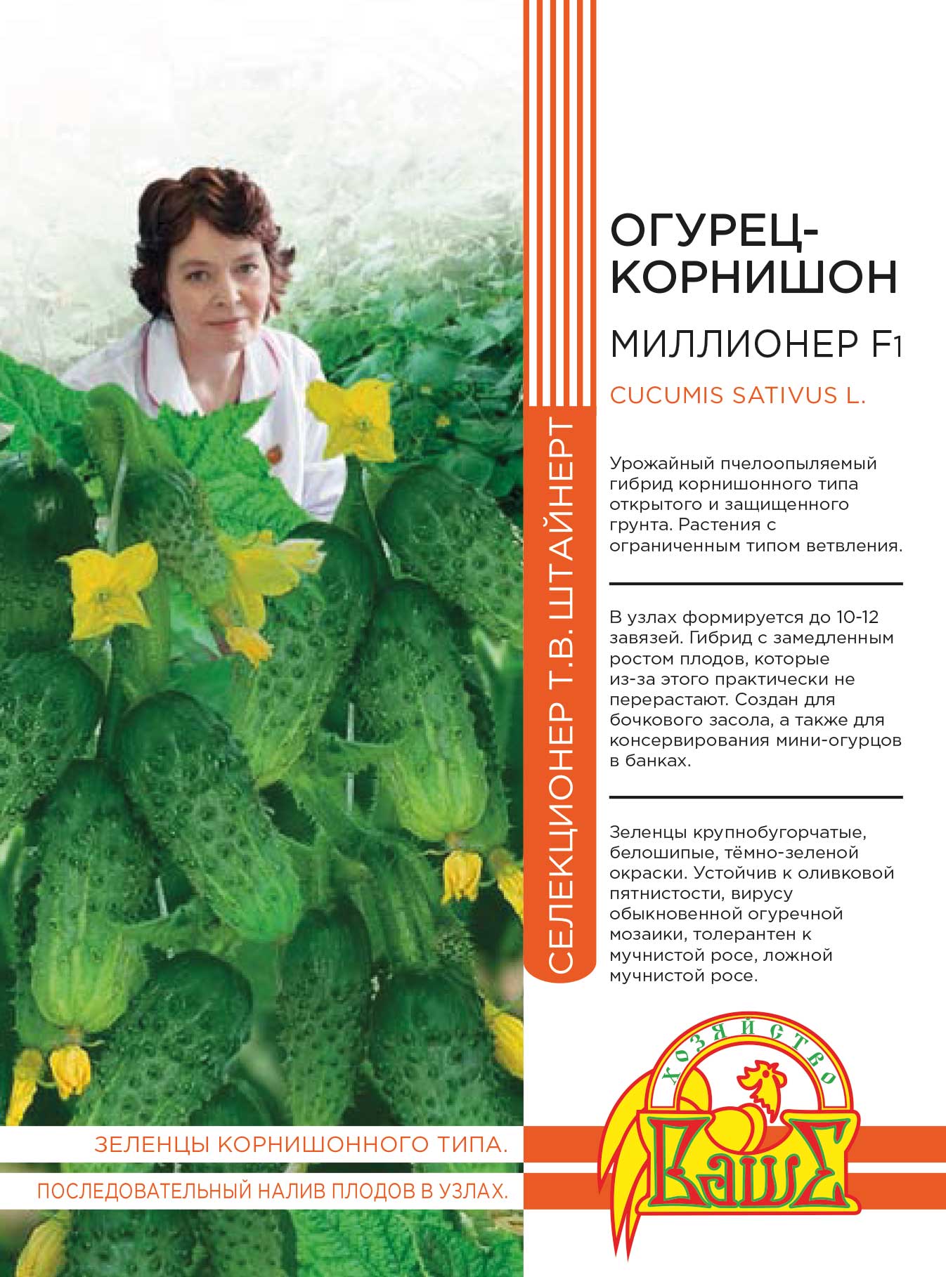 Среднеранний (50–52 дня) пчелоопыляемый сорт универсального использования для выращивания под пленочными укрытиями.